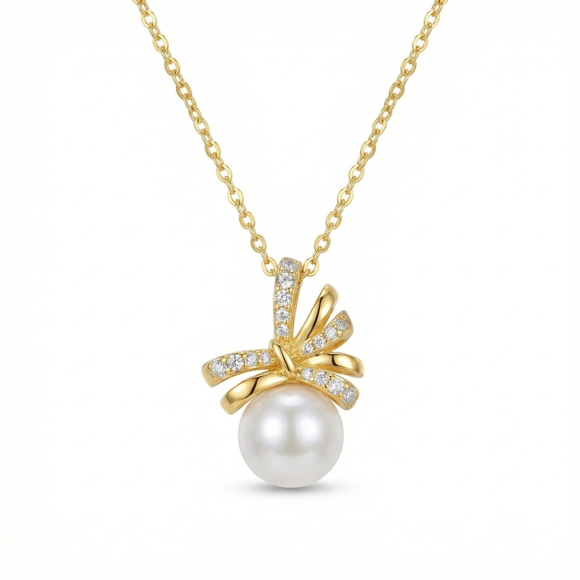 This exquisite necklace features a luminous white pearl gracefully suspended beneath a delicate ribbon-shaped pendant. The bow design is meticulously crafted with flowing, polished lines and adorned with brilliant-cut sparkling stones that add a touch of glamour and radiance. Hanging from a fine link chain, the warm metallic tone of the setting perfectly complements the soft glow of the pearl. This timeless piece blends classic sophistication with a whimsical charm, making it a versatile accessory for both formal events and refined everyday styling. Whether as a meaningful gift or a signature addition to your jewelry collection, this necklace captures elegance and femininity in every detail. Its artistic design and captivating luster ensure it remains a cherished piece for any jewelry lover seeking a touch of luxury and grace. | Brand: jewelryodm