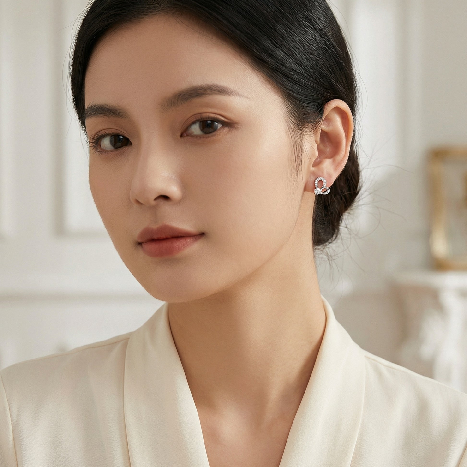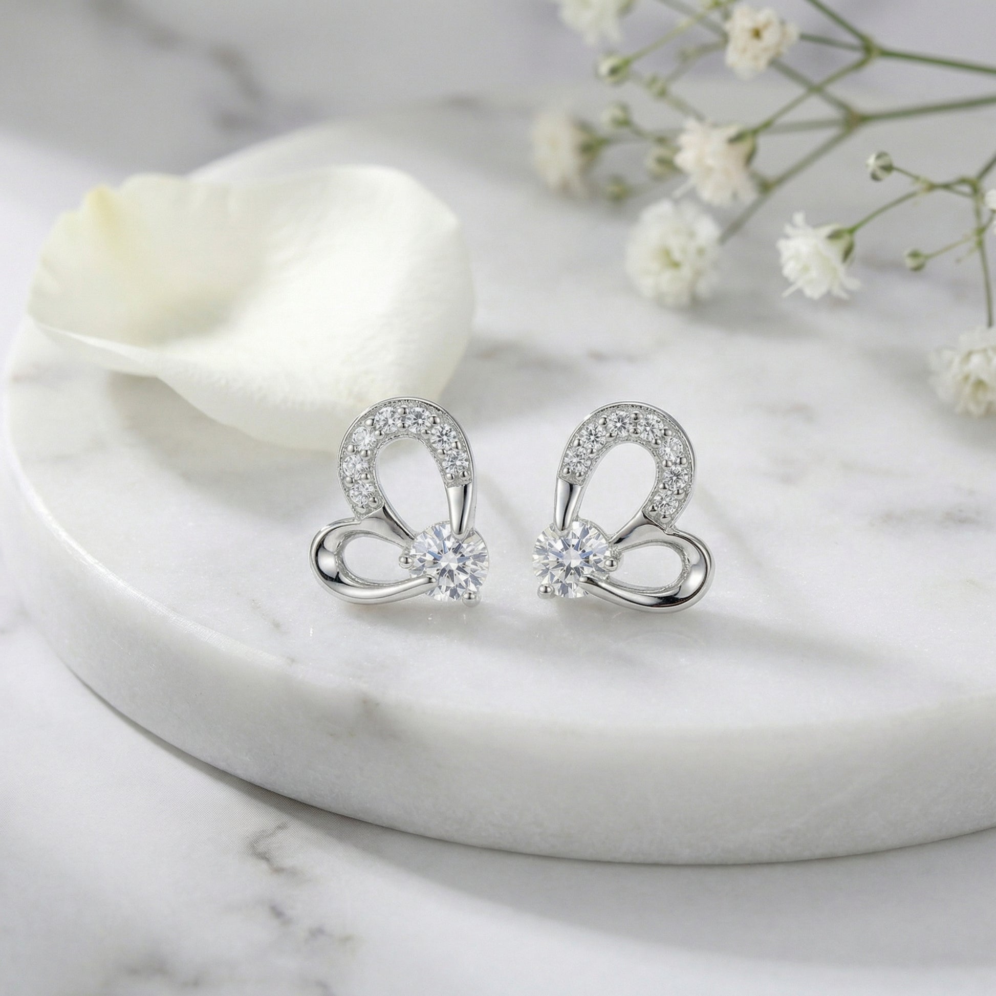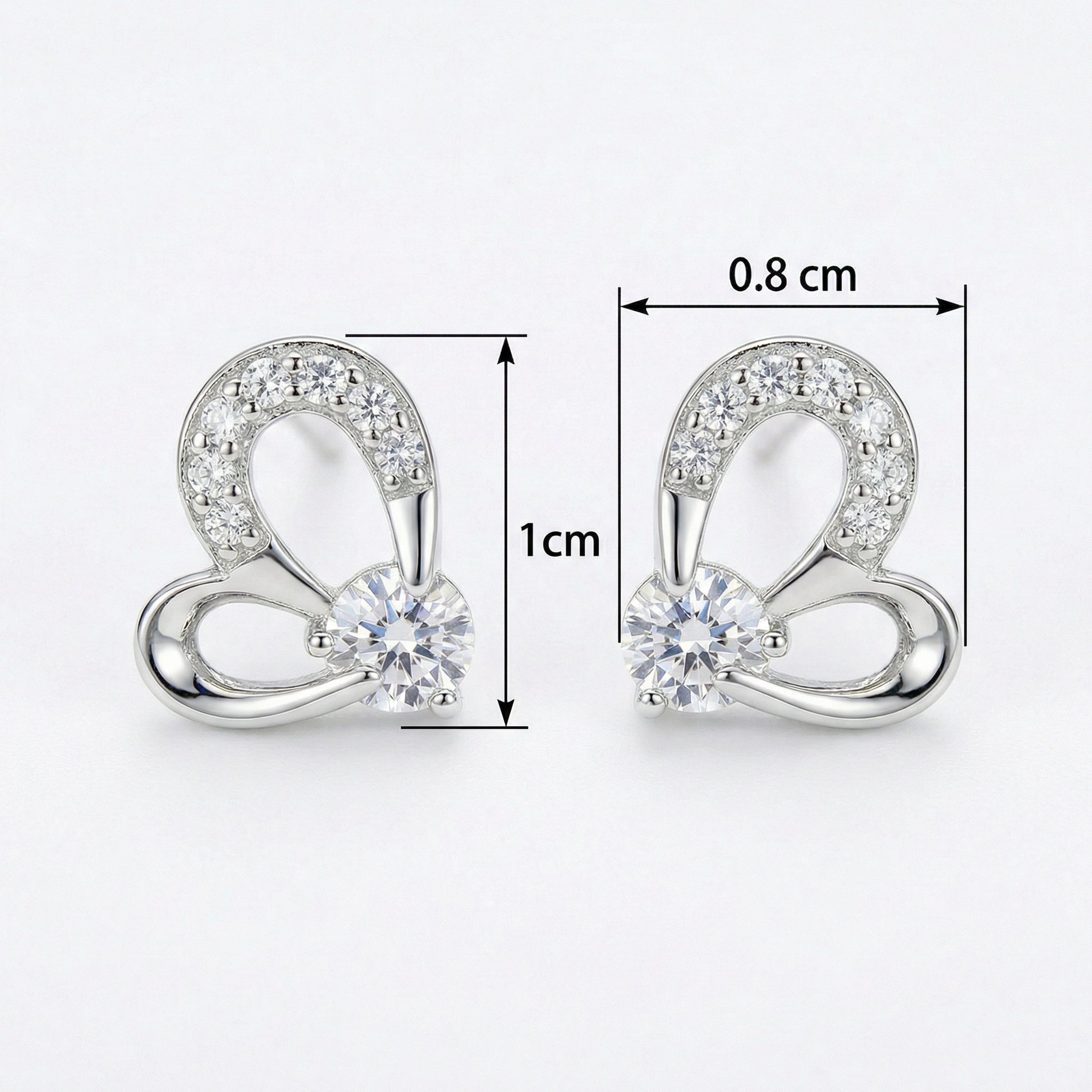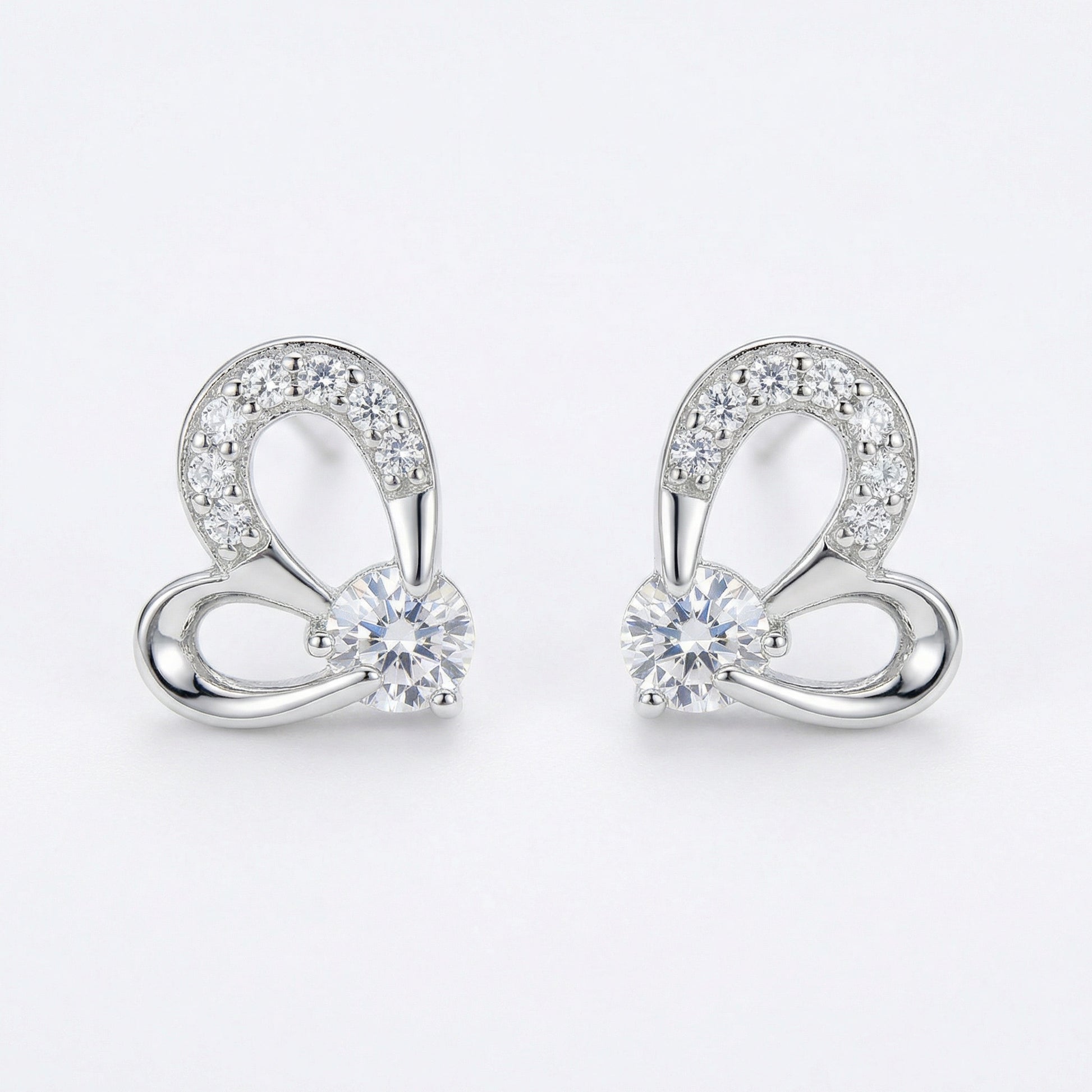 These exquisite sterling silver stud earrings feature a unique, stylized heart design that perfectly balances modern elegance with timeless romance. Each earring showcases a brilliant, large round-cut cubic zirconia at its center, held securely in a four-prong setting. The upper curve of the heart is delicately pavé-set with smaller shimmering stones, adding an extra layer of sparkle. Crafted with a high-polished finish, these earrings are designed to catch the light from every angle. Their dainty yet sophisticated silhouette makes them a versatile accessory, suitable for both daily wear and special occasions. Whether as a meaningful gift for a loved one or a treat for yourself, these sparkling heart studs are a beautiful expression of love and grace. The secure backings ensure a comfortable and reliable fit for all-day elegance. | Brand: jewelryodm